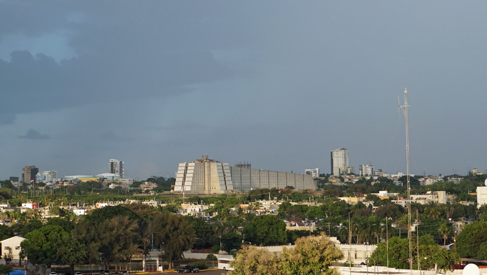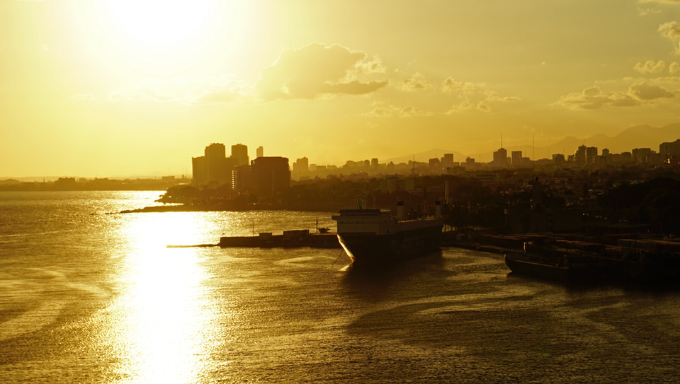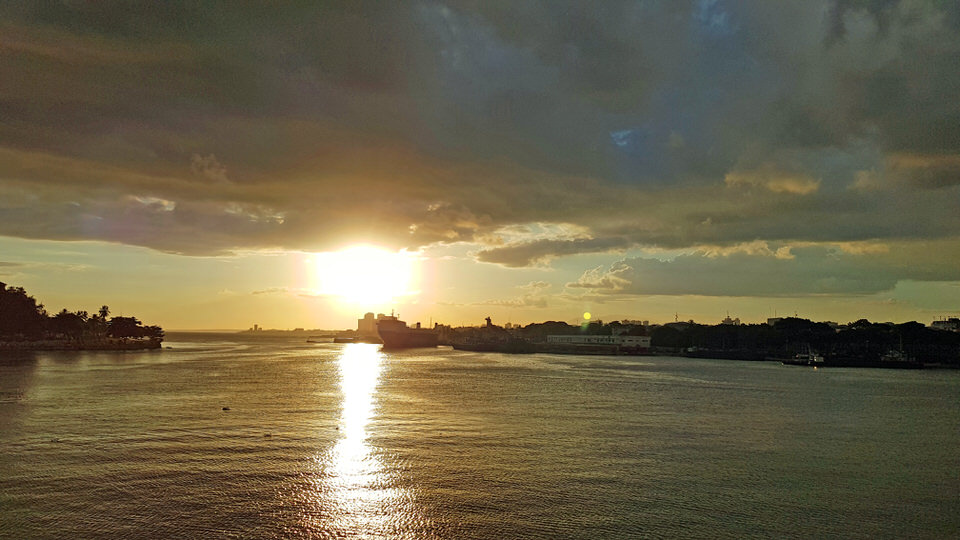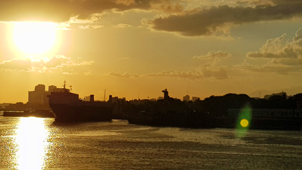 Die Sonne geht unter und taucht Santo Domingo in ein warmes Licht. Von Deck aus beobachten wir den Sonnenuntergang. Von hier aus können wir das riesige Kolumbus-Denkmal erkennen. Dieser gigantische Betonbau sieht von oben wie ein großes Kreuz aus, nachts ist es herrlich beleuchtet. Von der Seite sieht es einfach wie ein Betonklotz aus 😦