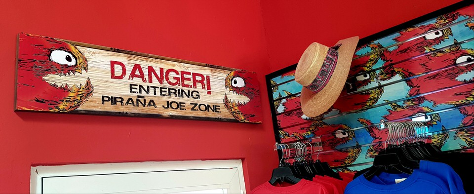 Vor dem Hafenterminal sind einige Souvenirläden, die zum Bummeln einladen und in einer Ecke blitzt tatsächlich das Logo von Piranha Joe auf! Das ist ja klasse. Werde ich hier fündig 🙂