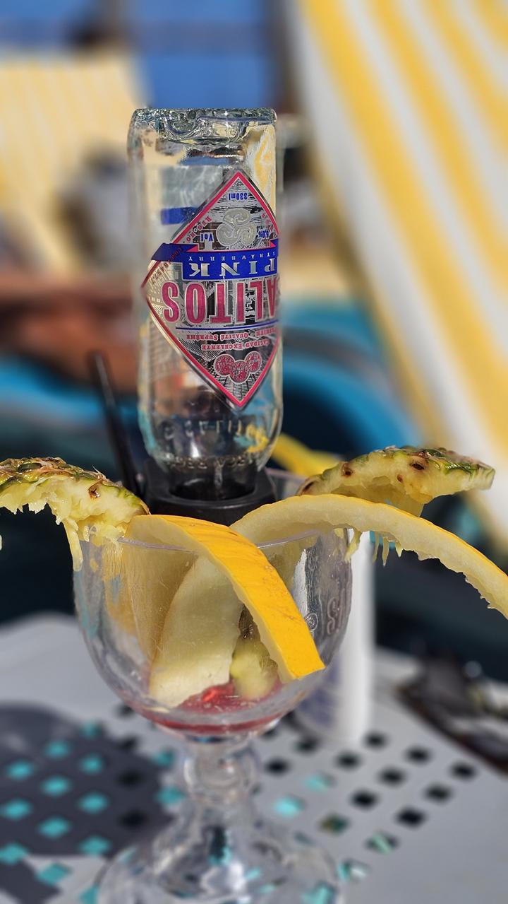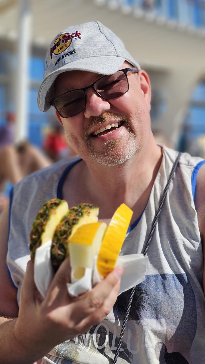Auf dem Pooldeck wird heute als süße Überraschung fruchtige Ananas und Melone serviert. Genau das Passende für die warmen Temperaturen. Leckerer Drink und leckere Früchte in der Sonne – was will man mehr?