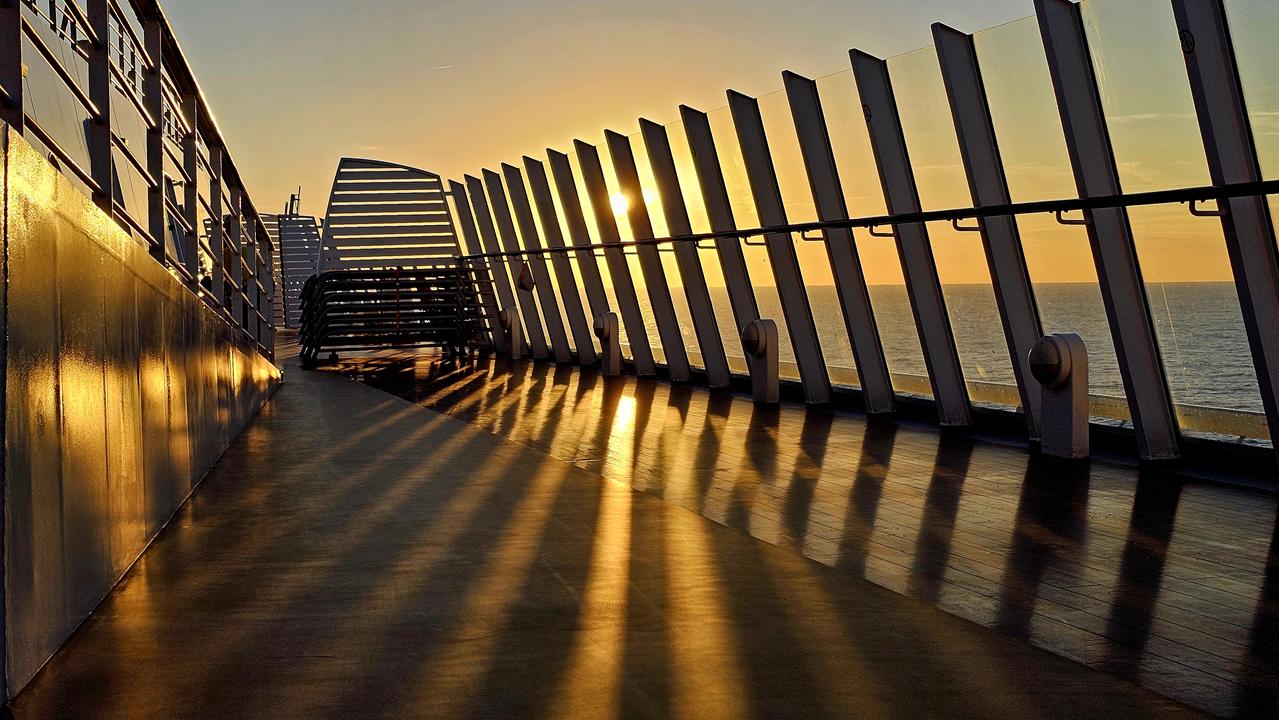An Deck ist total wenig los, wir sind fast alleine hier. Die anderen Gäste verpassen was: Die Strahlen der untergehenden Sonne zaubern wunderschöne Lichtspiele auf das Schiff. So schön!