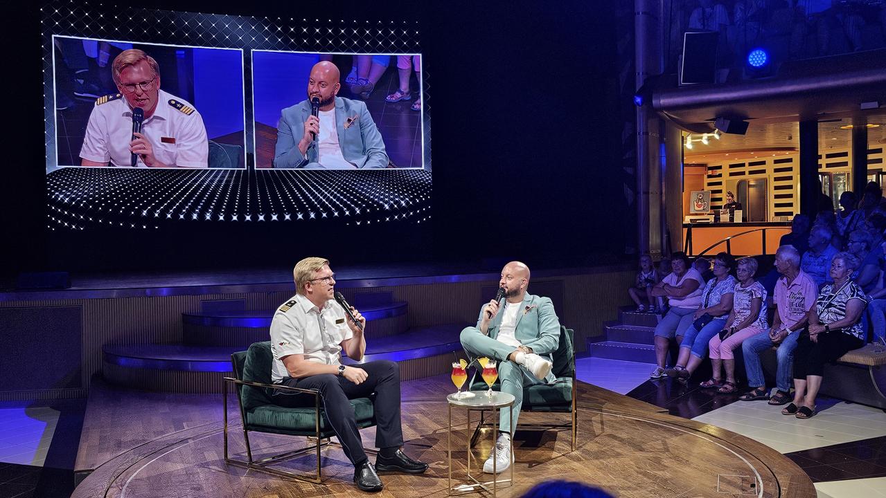 Ein Highlight heute: Im Theatrium steht in der Prime Time unser Kapitän Jan-Peter Lindner Rede und Antwort. Interessiert lauschen wir seinen Erzählungen, er erzählt anschaulich und humorvoll. Immer wieder landet er einen Lacher. Ein wirklich super sympathischer Kapitän!