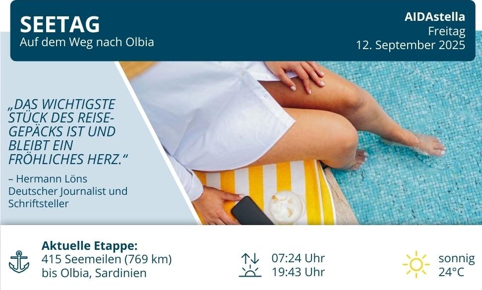 Ahoi Ahoi und Guten Morgen von unserem ersten Seetag auf dem Weg nach Olbia. Nach einer sehr ruhigen Nacht schlendern wir zum Frühstück ins Bella Donna auf Deck 11. Zufällig treffen wir dort Juli und Greg, wie schön! Nach einem netten Schwätzchen und einem leckeren Frühstück machen wir uns auf, um den Tag entspannt und in Ruhe zu genießen.