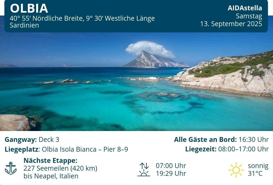 Guten Morgen und Ahoi aus Olbia auf Sardinien. Heute heißt es früh aufstehen. Um 8.00 Uhr legen wir an und um 9.00 Uhr beginnt unser Ausflug. Für heute haben wir den AIDA-Ausflug „OLB01 – Sardiniens Edelstein: Costa Smeralda“ gebucht. Ein Halbtagesausflug, der uns entlang der berühmten Edelsteinküste führt.