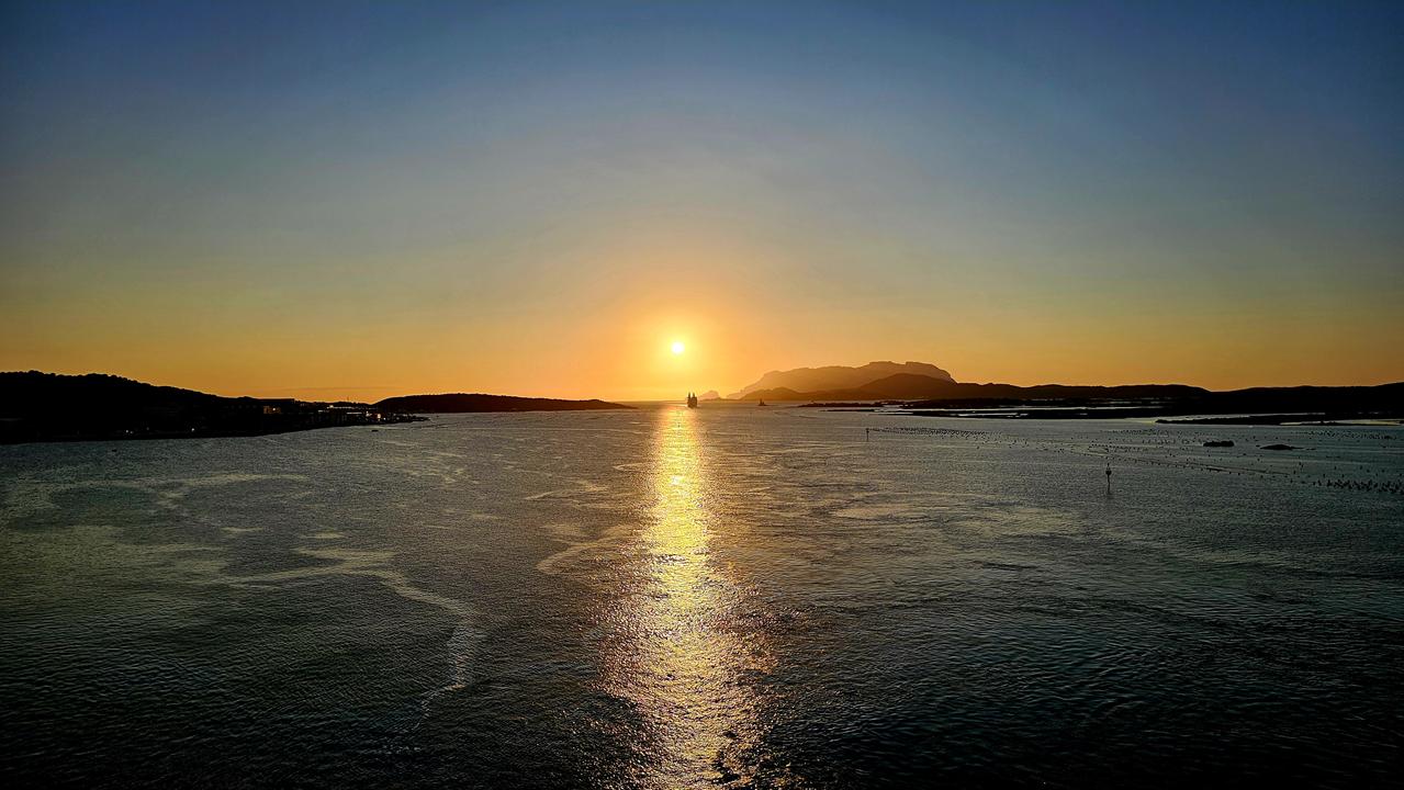Das schöne Wetter bringt uns einen schönen Sonnenuntergang. Langsam versinkt die Sonne in warmen Farben über dem Meer.