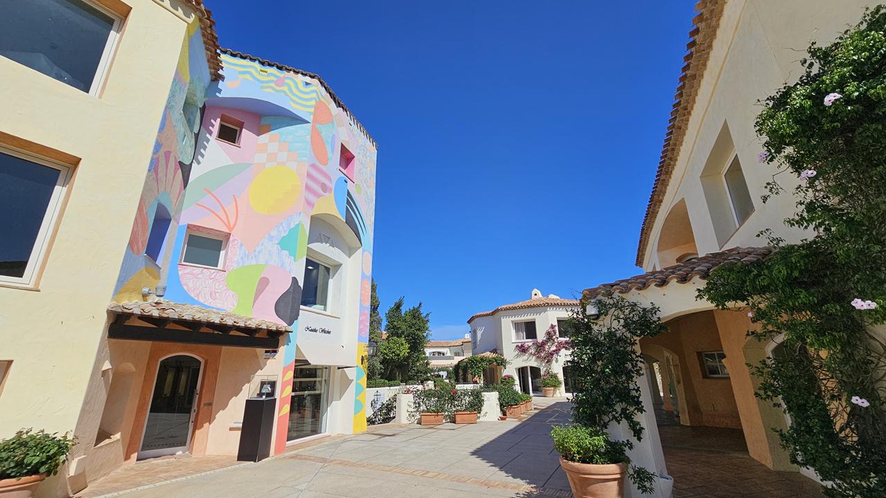 Die Häuser im neosardischen Stil haben geschwungene Fronten in zarten Farben. Überall entdecken wir schöne Streetart, auch in passenden Pastellfarben gemalt. Man wollte mit diesem architektonischen Konzept die Häuser und Bauten harmonisch in die umgebende Natur integrieren. Das ist wirklich gut gelungen.