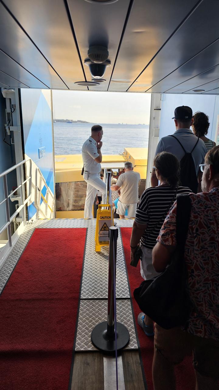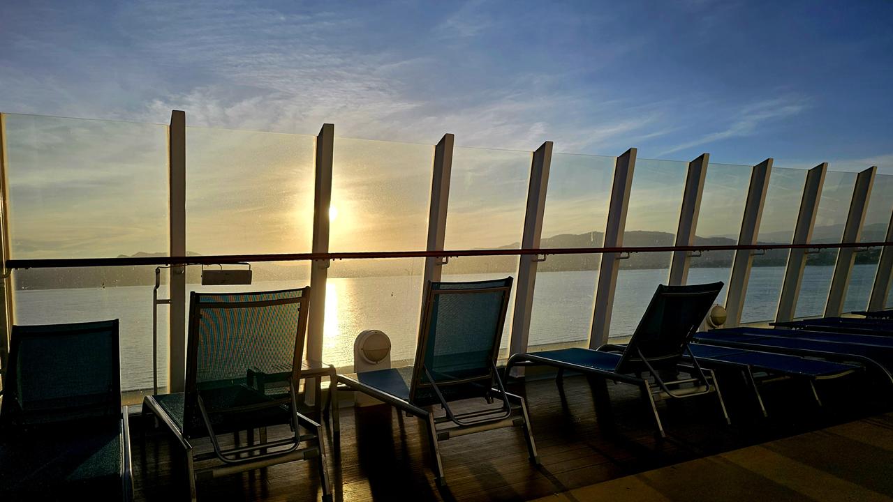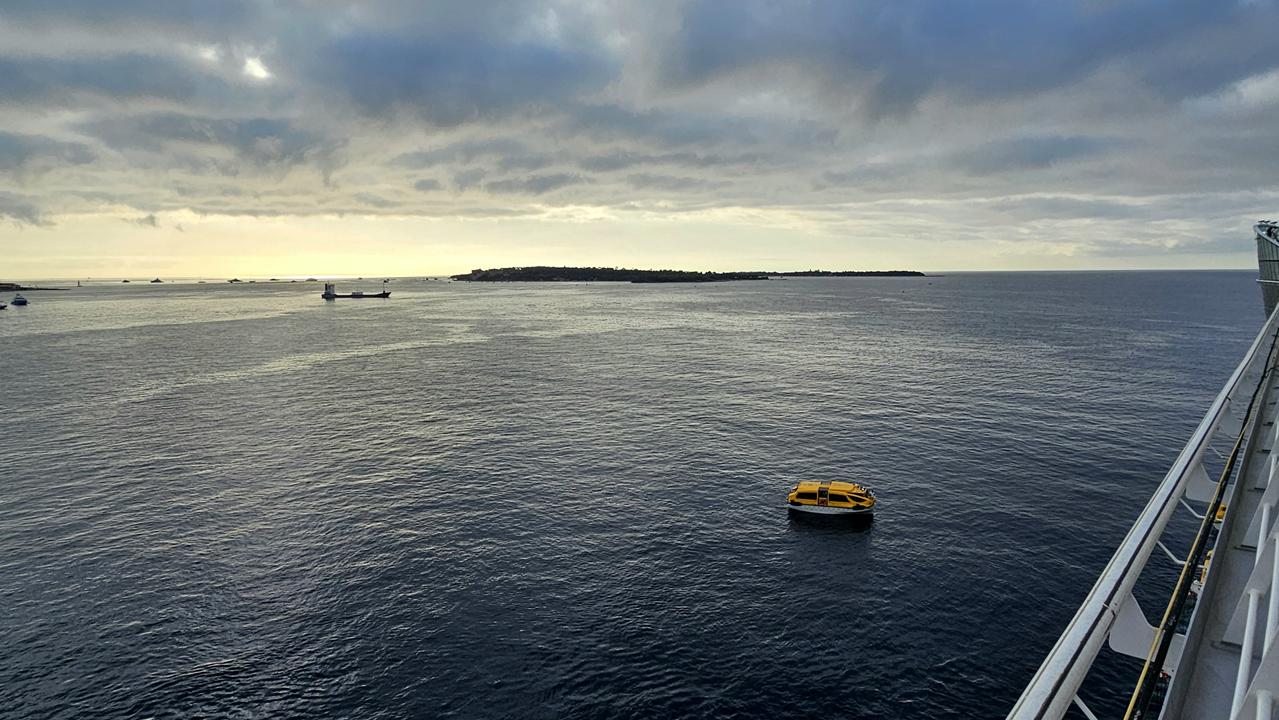 Um 9:45 Uhr machen wir uns auf den Weg zum Tenderboot. Und zwar auf Deck 5 im hinteren Treppenhaus. Wir sehen schon die Schlange, aber was ist das? Die Wartenden werden durch gezielte Absperrungen hinausgeführt auf das Außendeck. Und hier werden alle nach vorne geleitet zum vorderen Treppenhaus, dort geht’s zwei Decks tiefer auf Deck 3. Wie genial ist das denn!