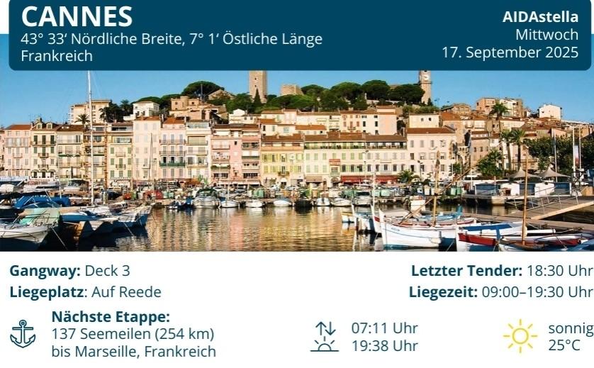Bonjour aus Cannes 🙂 Heute liegen wir auf Reede in der Bucht von Cannes, das bedeutet: Wir tendern heute! Für uns erstmal nix Besonderes. Haben wir schon öfter gemacht. Tendern ist immer ein Erlebnis, allerdings dauert der gesamte Vorgang immer etwas länger. Und hängt von einer guten Organisation der Reederei ab. Mal schauen wie es heute läuft.