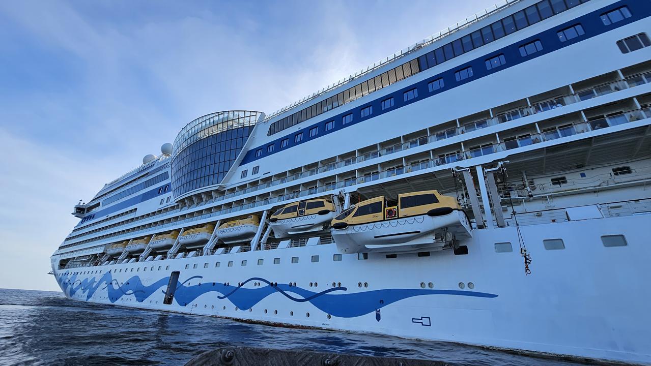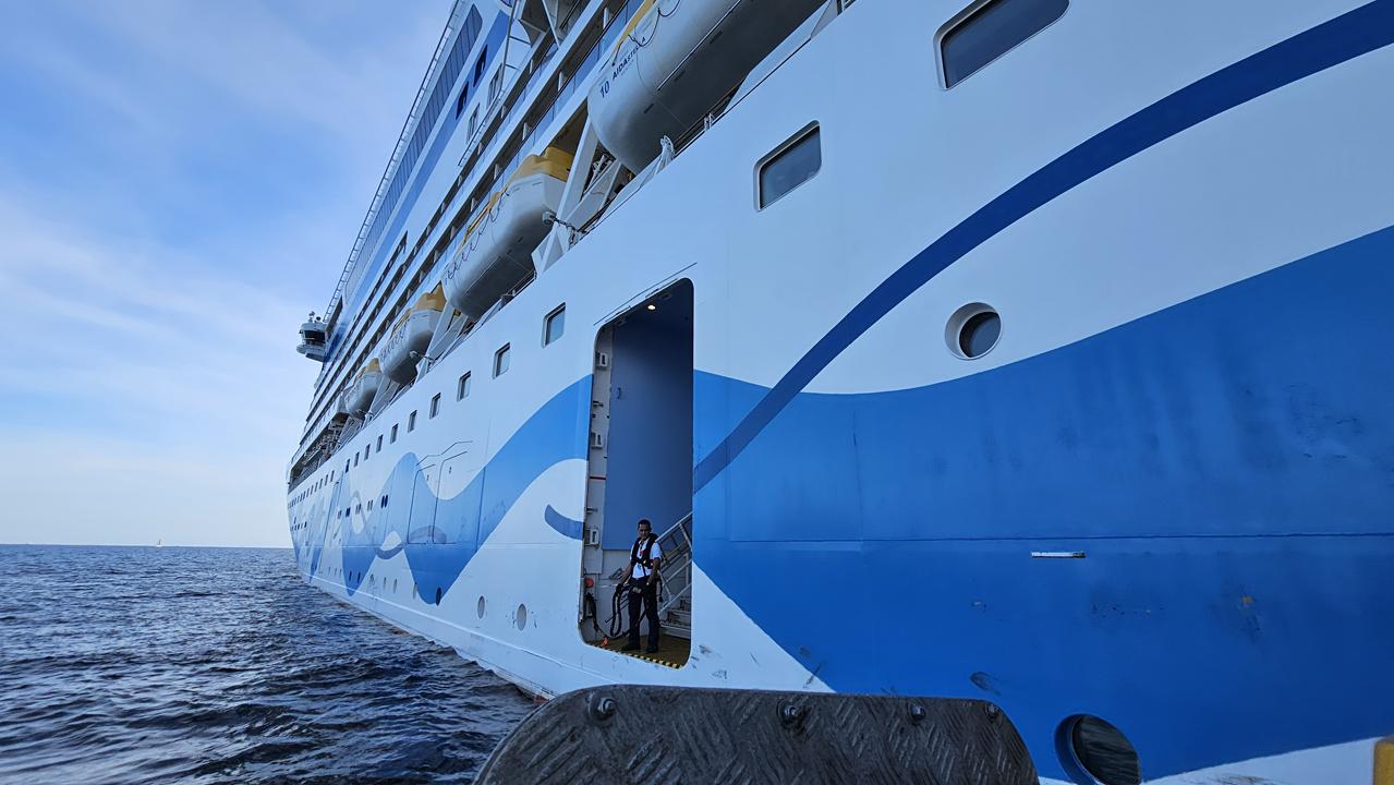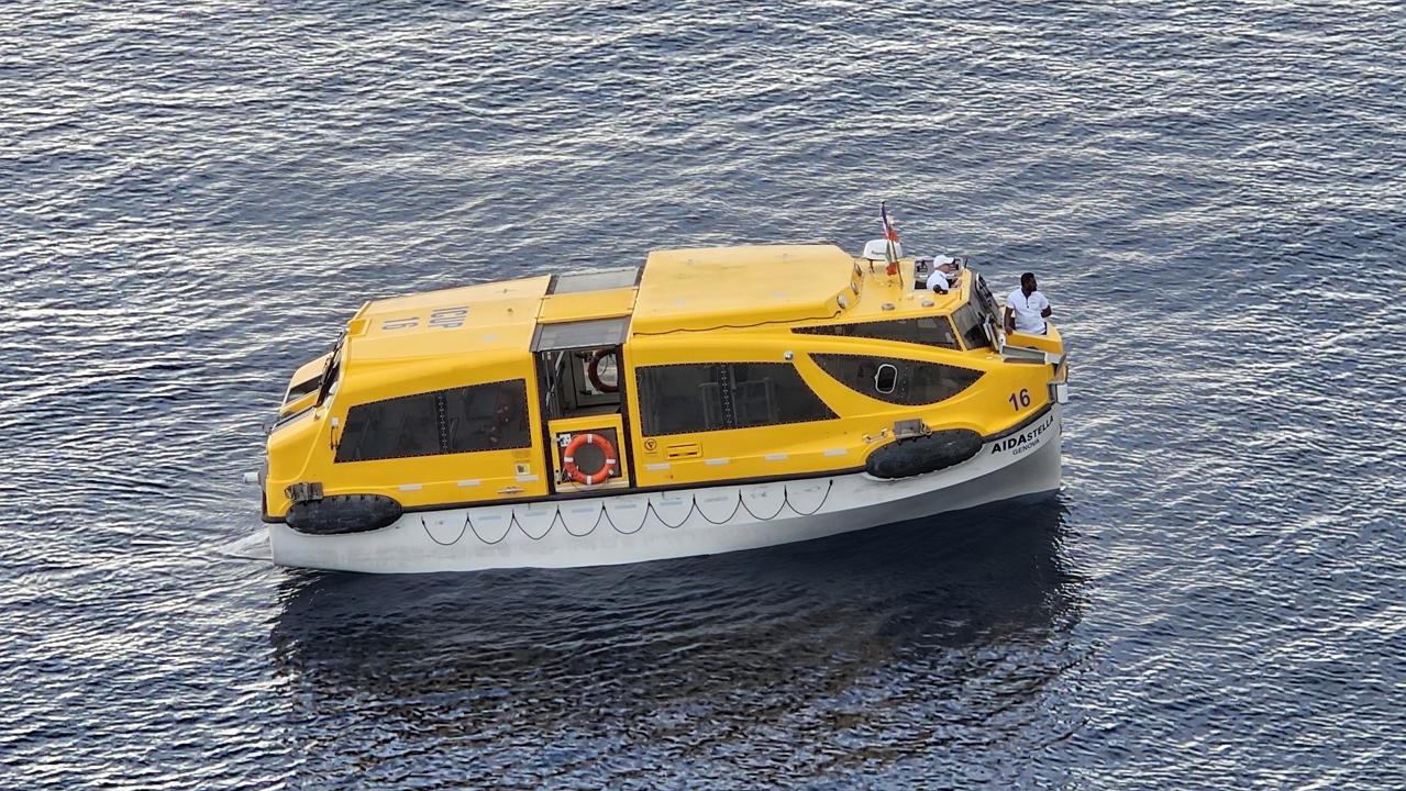 Um 16:45 Uhr erwischen wir ein Tenderboot und es geht zurück zum Schiff. Wie auf der Hinfahrt dauert die Fahrt rund 15 Minuten. Der Tender ist nicht so voll und wir können gut aus der Luke und den Türen hinaus spähen. Es gelingen ein paar gute Schnappschüsse von AIDAstella 🙂