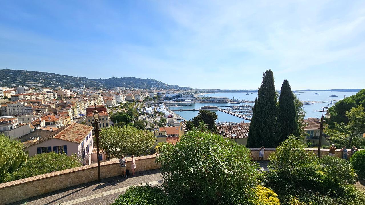 Auf dem höchsten Punkt des Hügels, dem Vorplatz des Kastells – dem Place de la Castre – genießen wir einen fantastischen Panoramablick auf Cannes, den alten Hafen und die Lérins-Inseln. Der Aufstieg über die Treppen und Gassen des Le Suquet-Hügels hat sich gelohnt. Von hier haben wir einen wunderschönen Blick auf den Hafen und Strand von Cannes und die umliegende Landschaft.