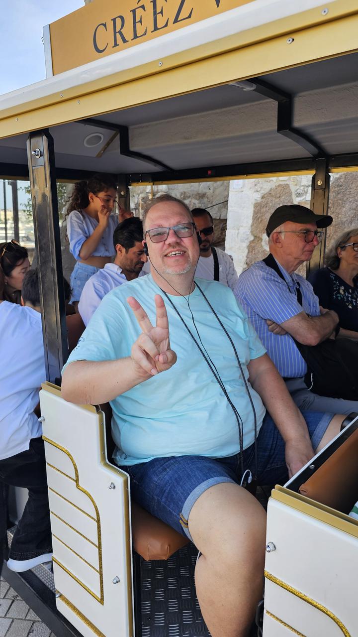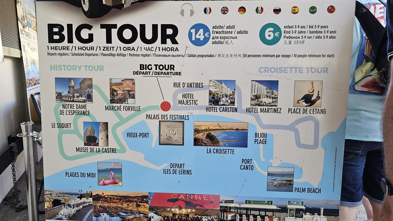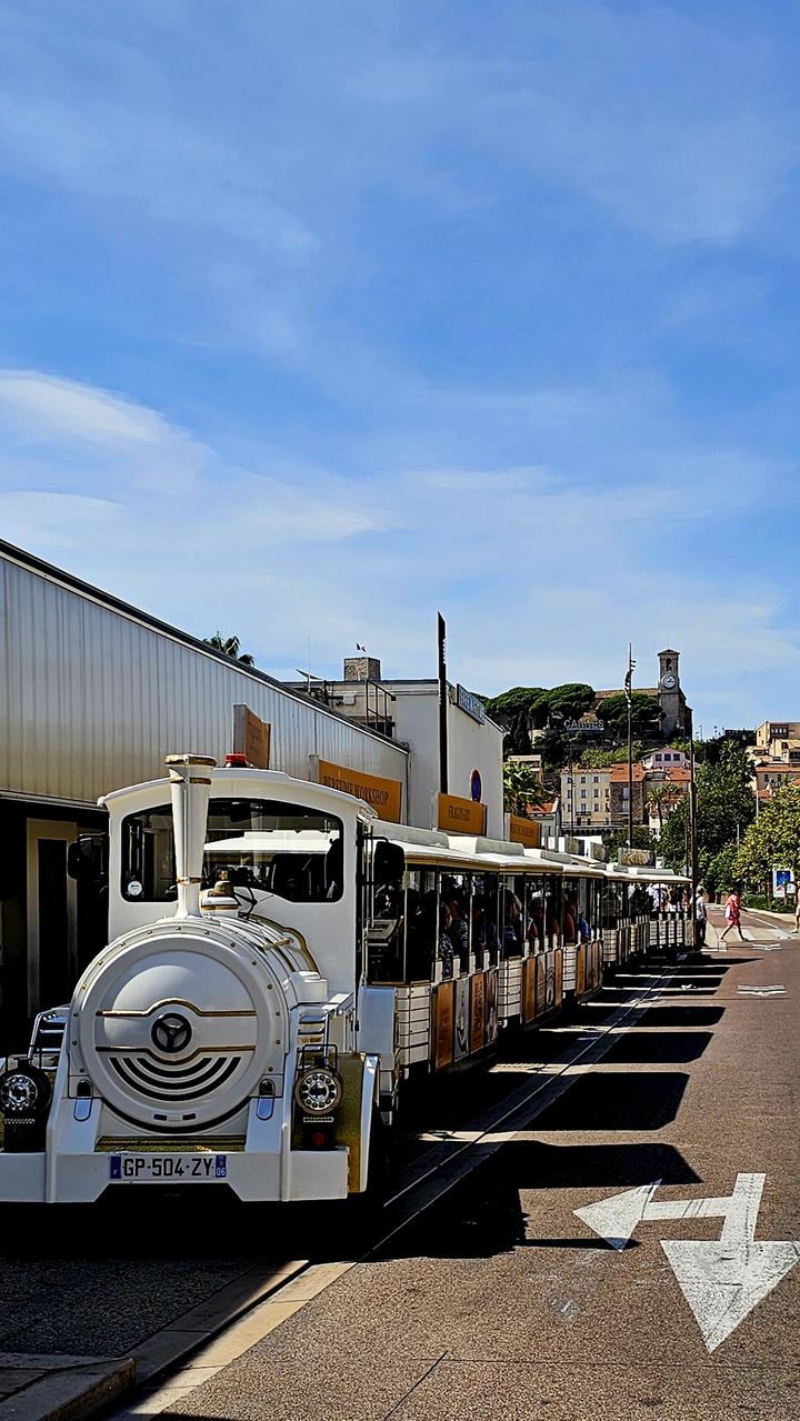 Inzwischen sind wir am Palais des Festivals angekommen. Die Croisette ist nicht mehr weit. Aber die Sonne brennt – es ist superheiß 🌞🌞 Die Hitze ist enorm, also entscheiden wir uns spontan für eine einstündige Fahrt mit der Bimmelbahn (14 € pro Person, Stand 09/25). Die Entscheidung fällt nicht schwer. Wir sitzen im Schatten und danach sind wir hoffentlich wieder ausgeruht.