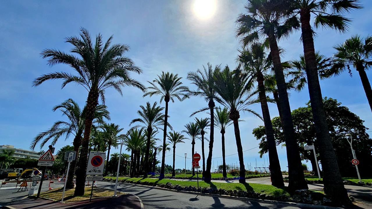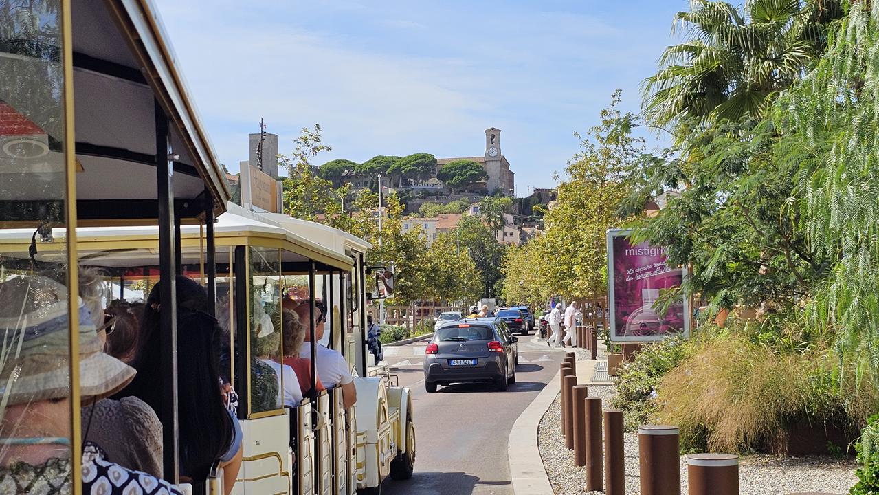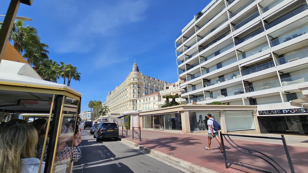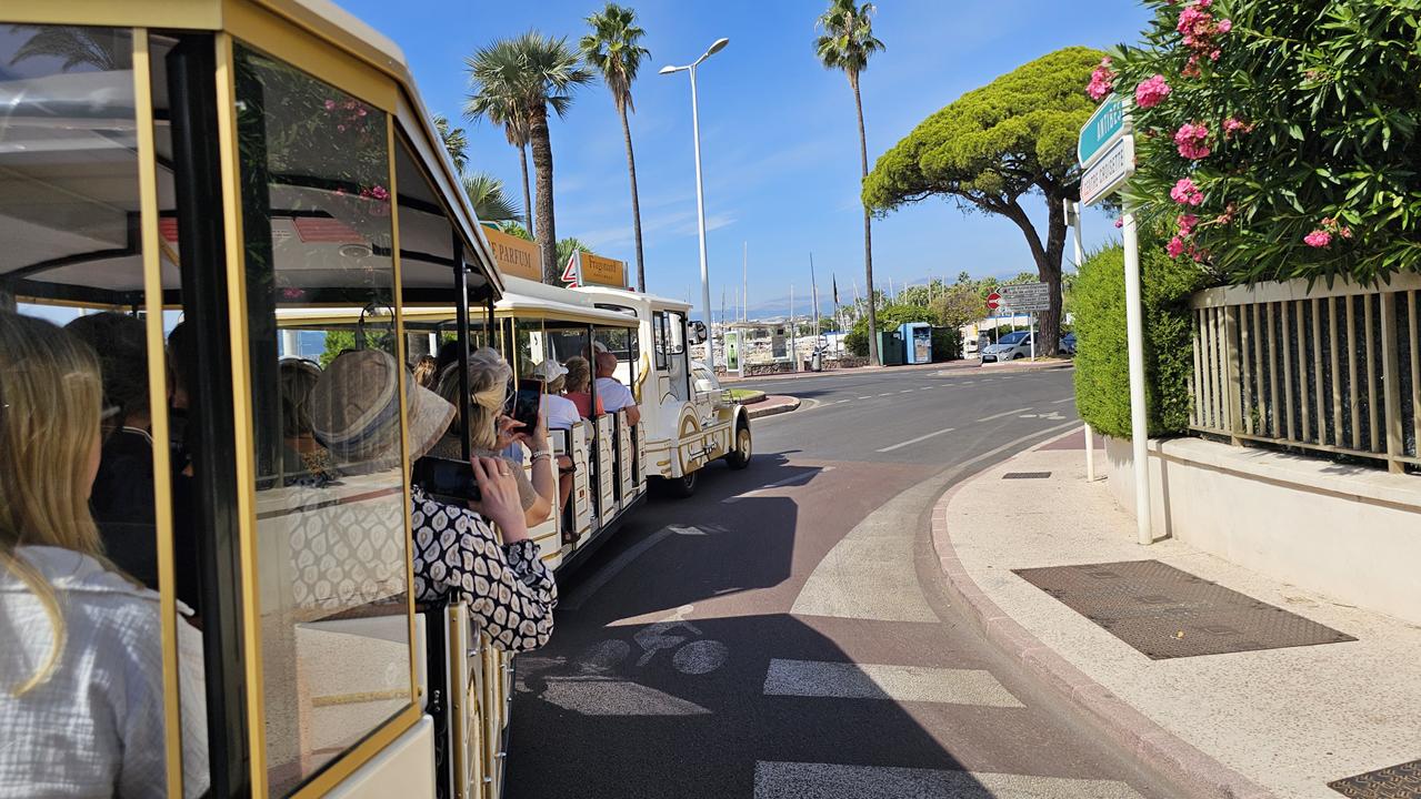 Der Zug füllt sich schnell und nach kurzer Wartezeit geht’s schon los. Vorbei am Palais des Festivals, entlang des Boulevard de la Croisette mit riesigen Palmen. So schön!