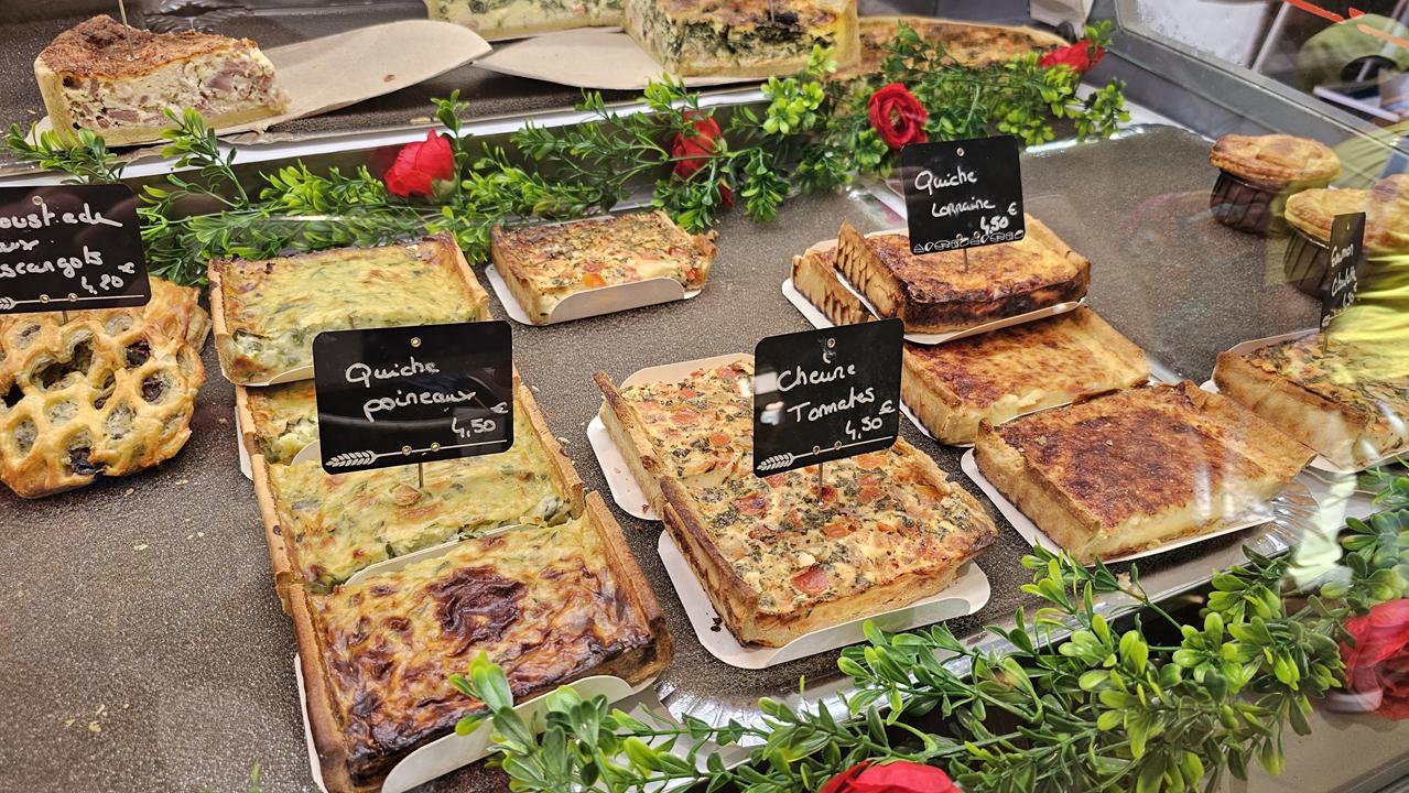 Auf dem Markt haben wir uns mit lokalen Leckereien eingedeckt und wir probieren Quiche Lorraine und frittierte Zucchiniblüten – ein Genuss! Dazu frisch gepresster Saft – perfekt bei der Hitze.