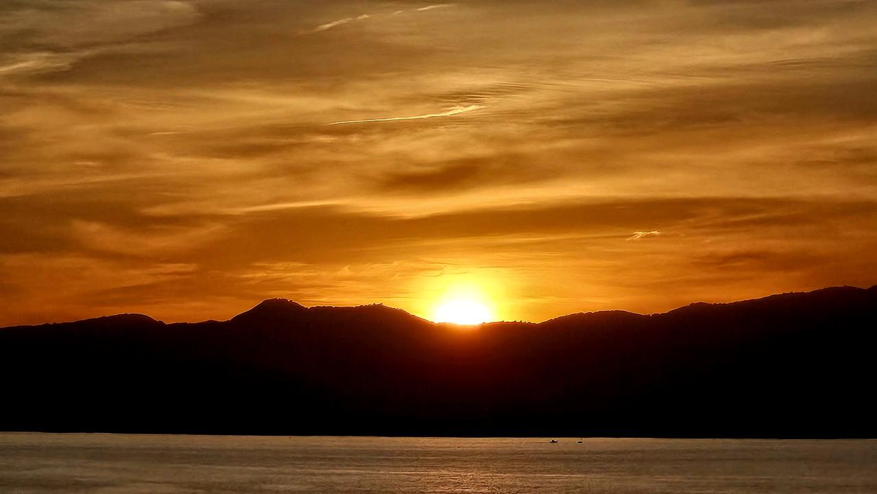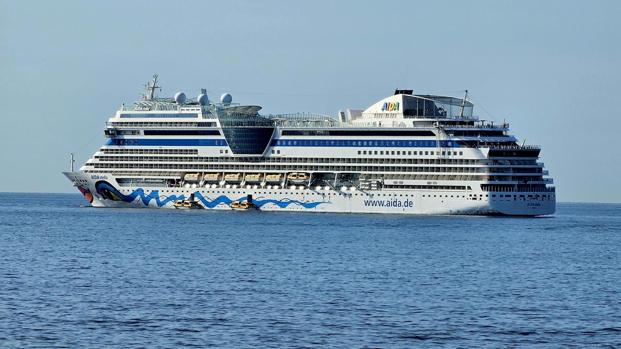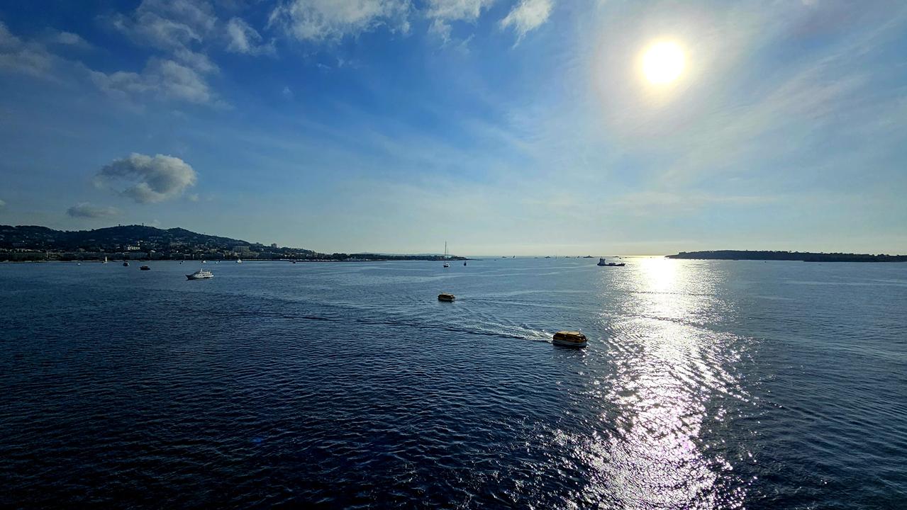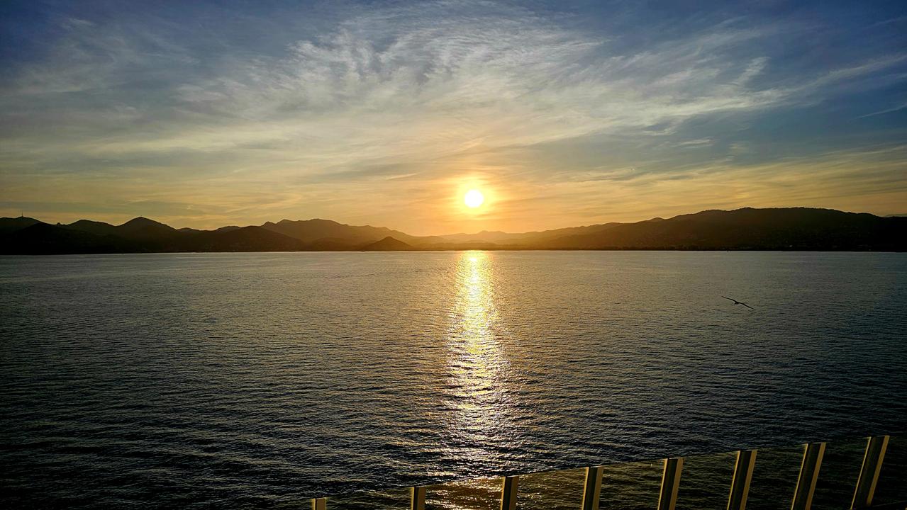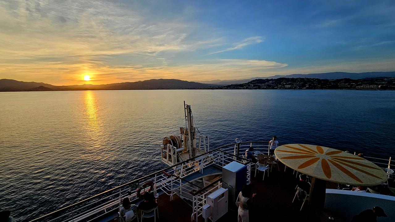 Der Sonnenuntergang über dem Meer in der Bucht von Cannes ist ein wundervolles Schauspiel voller Wärme. Die Sonne sinkt langsam dem Horizont entgegen und taucht den Himmel in leuchtende Farben – sattes Rot, weiches Orange und sanftes Gelb fließen ineinander und spiegeln sich auf der ruhigen Wasseroberfläche. Langsam setzt sich AIDAstella in Bewegung, zieht eine feine Spur im Wasser und verabschiedet sich von Cannes.