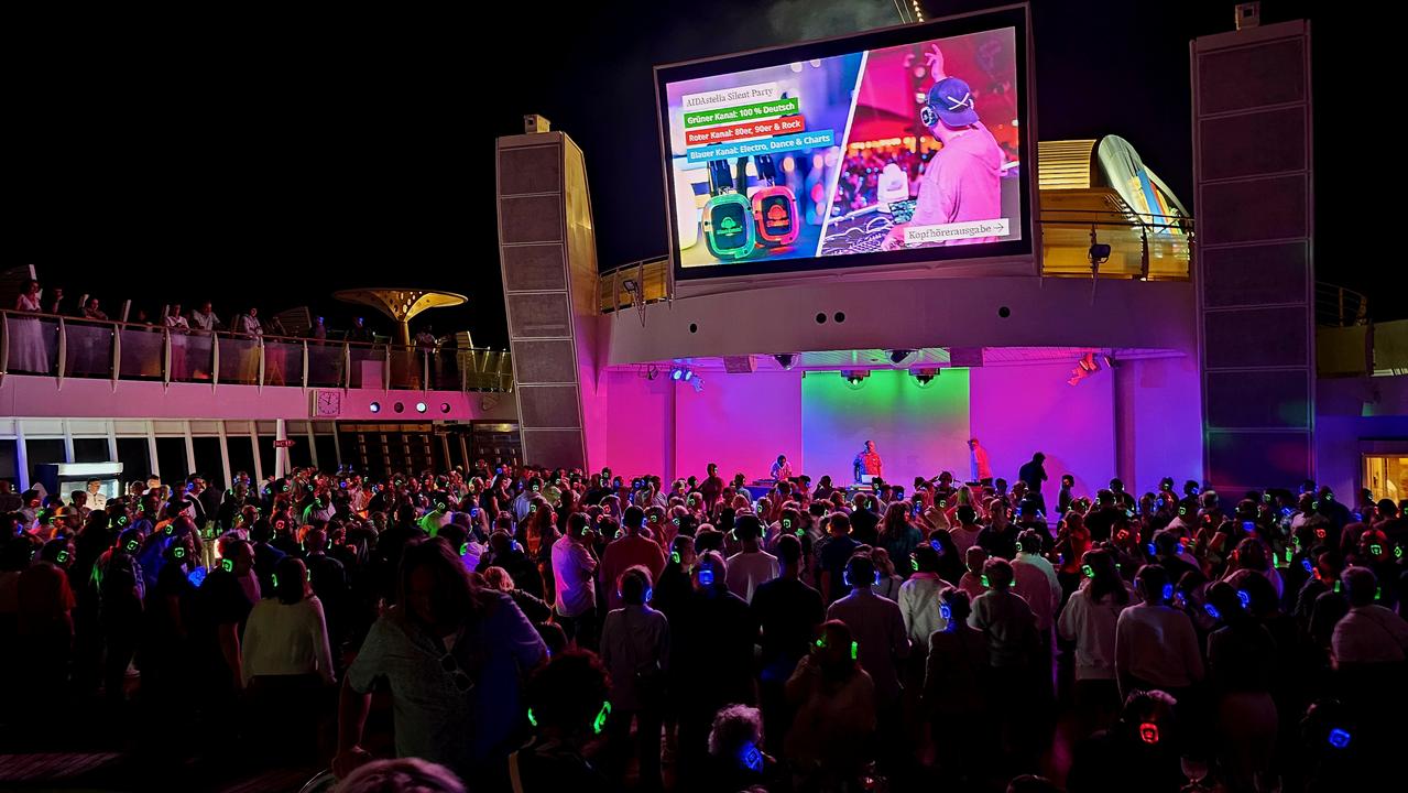 Und dass die Party Spaß macht, das sehen viele andere Gäste ganz genauso: Das Poodeck ist rappelvoll, jeder hat Kopfhörer auf den Ohren, die Stimmung ist riesig! Immer wieder wechseln wir die Kanäle und singen lauthals mit. Wirklich lustig, wenn man mal den Kopfhörer abnimmt 🙂 Ein „Durcheinander-Gesang“ was das Zeug hält 🙂