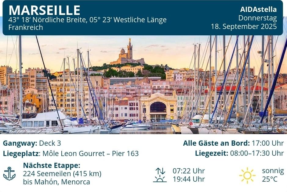 Ach ja, kurzer Spoiler: Es war gut, dass wir uns für den AIDA-Shuttle entschieden haben! Schon im Vorfeld hat Torsten im Internet gelesen, das genau heute am 18.09.26 in Frankreich ein Generalstreik stattfindet. Frankreich steht sozusagen still. Überall sollen Demos stattfinden, auch in Marseille. Der Kapitän hat gestern ebenfalls darauf hingewiesen und um Verständnis gebeten, wenn in Marseille nicht alles normal abläuft. Die von AIDA geplanten Ausflüge wären aber nicht betroffen.
