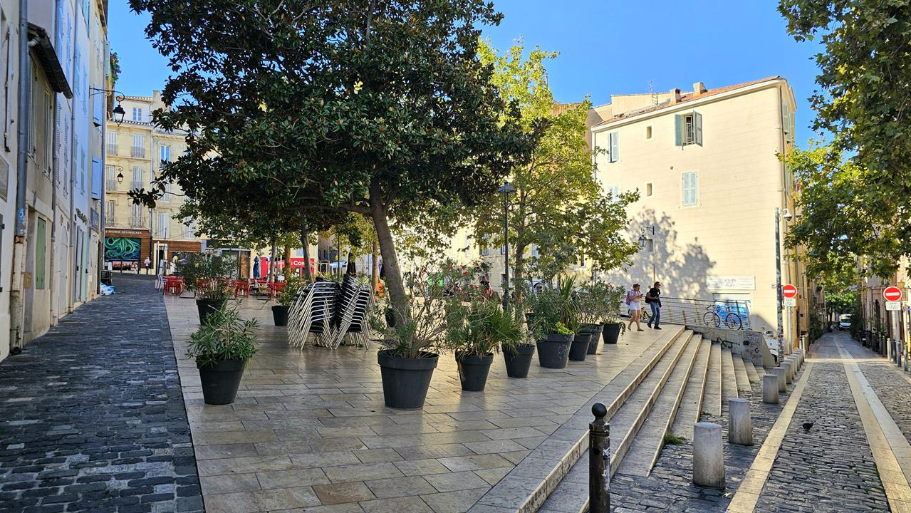 Wir erreichen den Place Villeneuve-Bargemon. Dieser Platz liegt im Herzen von Marseille, nahe dem Alten Hafen – dem „Vieux-Port“ – und dem historischen Viertel Le Panier. Ein schöner, großer Platz mit lebendiger Atmosphäre. Hier steht auch das Maison Diamantée, das Diamantenhaus. Ein historisches Juwel aus dem Jahr 1570, bekannt für seine einzigartige Fassade aus Natursteinen, die wie geschliffene Diamanten wirken.