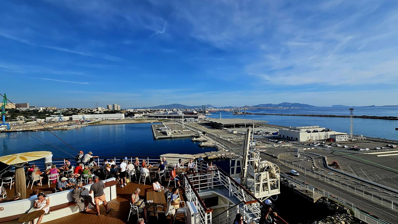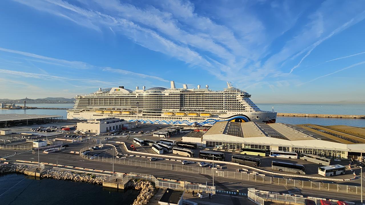 Pünktlich um 8:00 Uhr liegen wir im Hafen von Marseille. Der Hafen befindet sich weiter außerhalb im Industriehafen. Einfach so zu Fuß in die Stadt laufen ist zu weit. Es gibt wohl kostenlose Hafen-Shuttlebusse, die unregelmäßig am Hafenausgang warten und ins Zentrum fahren. Das scheint uns ein wenig unsicher, wir wählen daher den sicheren Weg mit dem AIDA-Shuttlebus. Der fährt regelmäßig, letzter Shuttle zurück um 16:15 Uhr.
