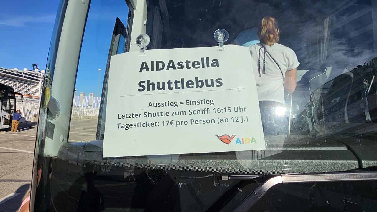 Wir steigen wieder die Treppen hinab und laufen zum Treffpunkt des Shuttlebusses. Perfekt, es steht gerade ein Shuttle da, wir können direkt einsteigen. Schon 5 Minuten später fahren wir los. Es ist jetzt 14.50 Uhr und 15 Minuten später sind wir wieder zurück auf AIDAstella. Das ist ja mal super gelaufen!