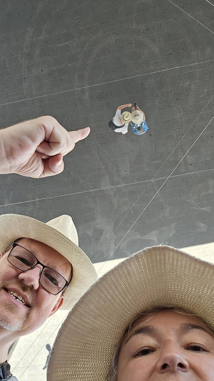 Das Besondere passiert allerdings darunter: Die stark spiegelnde Unterseite reflektiert alles, was sich darunter bewegt – Fußgänger, Marktstände, Straßenkünstler und natürlich auch uns. Je nach Tageszeit entstehen ständig neue Perspektiven, weshalb hier eigentlich immer Menschen stehen und nach oben fotografieren. Kein Wunder, der Pavillon ist wie gemacht für ungewöhnliche Erinnerungsfotos.