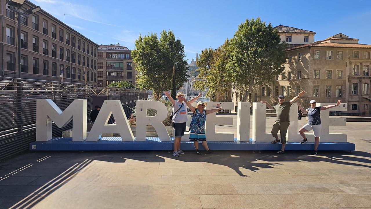 Und HA! Was sehen wir da? Ein riesiger Schriftzug „MARSEILLE“! Zum Glück ist noch nicht so viel los. Schnell einen anderen Touristen angequatscht, damit er ein Foto uns vieren an dem Schriftzug macht 🙂