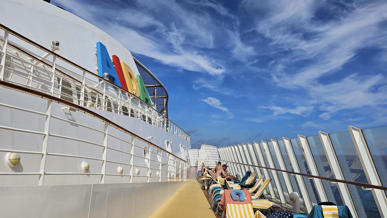 Nachdem wir heute mal länger geschlafen haben, lassen wir das Frühstück ausfallen und suchen uns einen Platz auf dem Pooldeck. Gar nicht so einfach – alle anderen sind schon da 😉 Wir ergattern zwei Liegestühle auf Deck 12 unterhalb des AIDA Schriftzuges. Ein Sonnenplatz, aber das stört uns nicht. Es weht ein angenehmes Lüftchen, die Sonnenstrahlen sind angenehm und der Ausblick ist einfach unbezahlbar 🙂