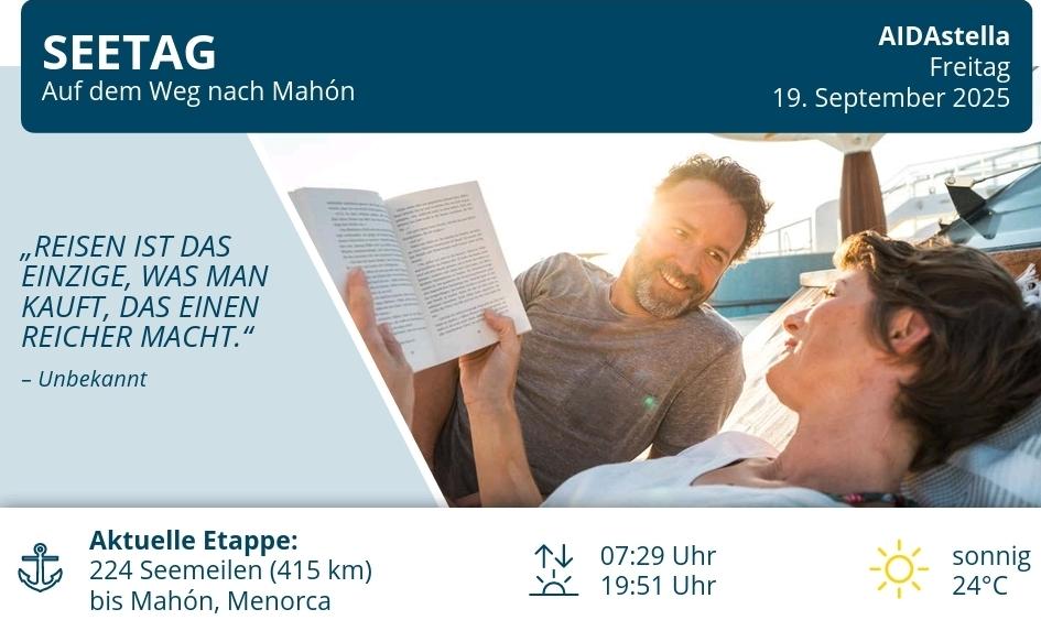 Guten Morgen und Ahoi von unserem Seetag. Wir sind auf dem Weg nach Menorca, nach Mahón um genau zu sein. Aber heute genießen wir erst einmal einen entspannten Tag auf See.