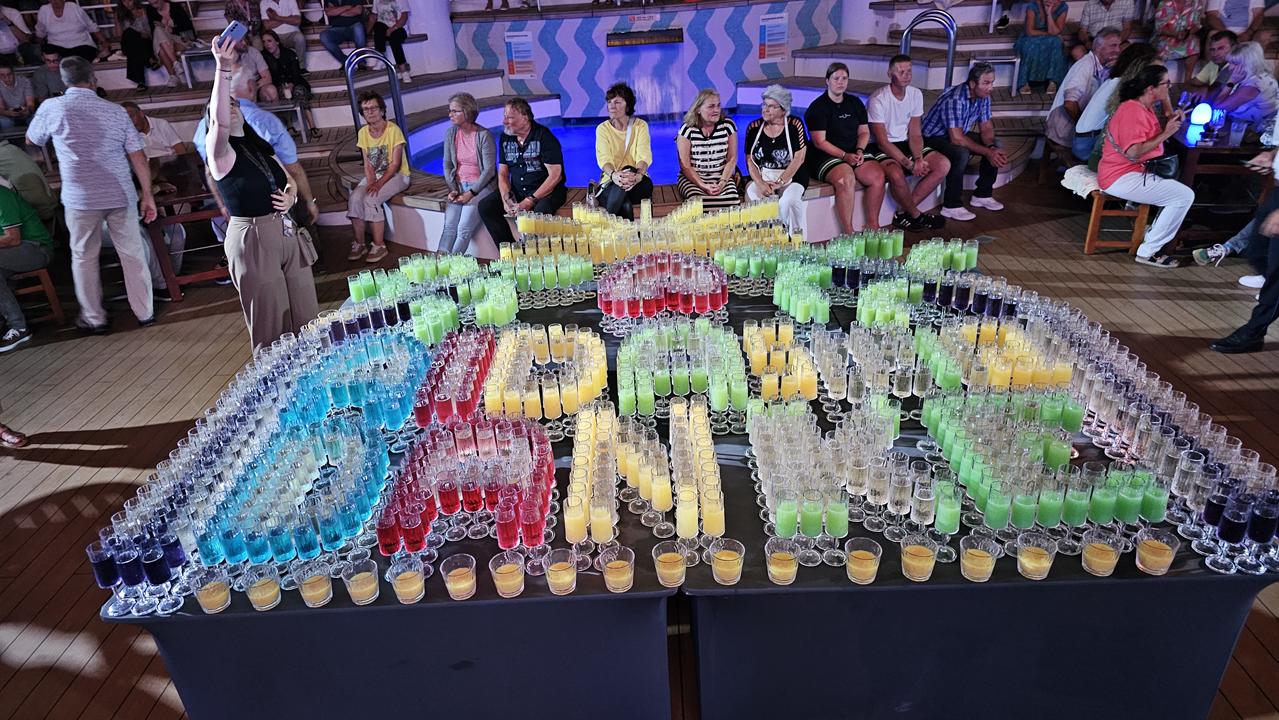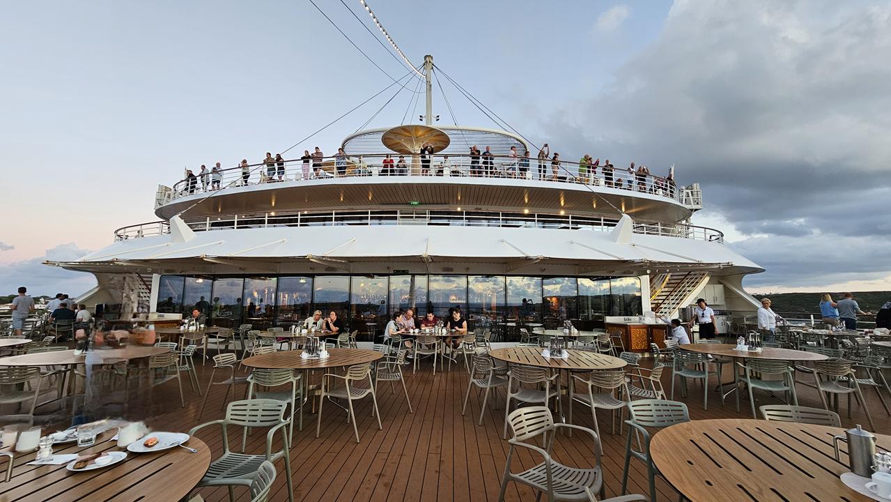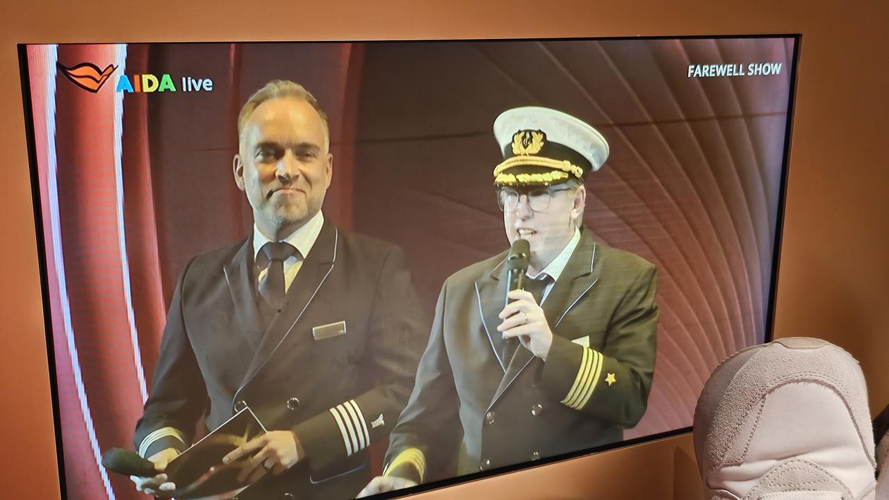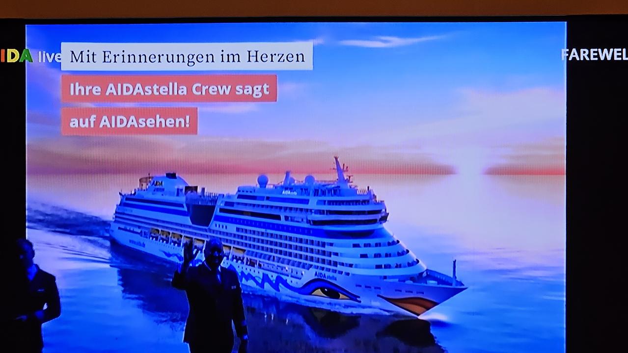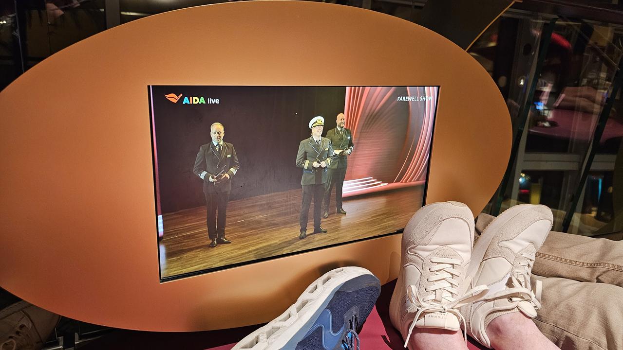 Das Theatrium ist bis auf den letzten Platz gefüllt – wir finden keinen Platz mehr. Doch auf Deck 11 entdecken wir freie Liegeinseln. Perfekt! Von hier aus verfolgen wir die Show auf dem Bildschirm und hören gleichzeitig live die Musik und Ansprachen. Bequemer geht’s kaum 😊