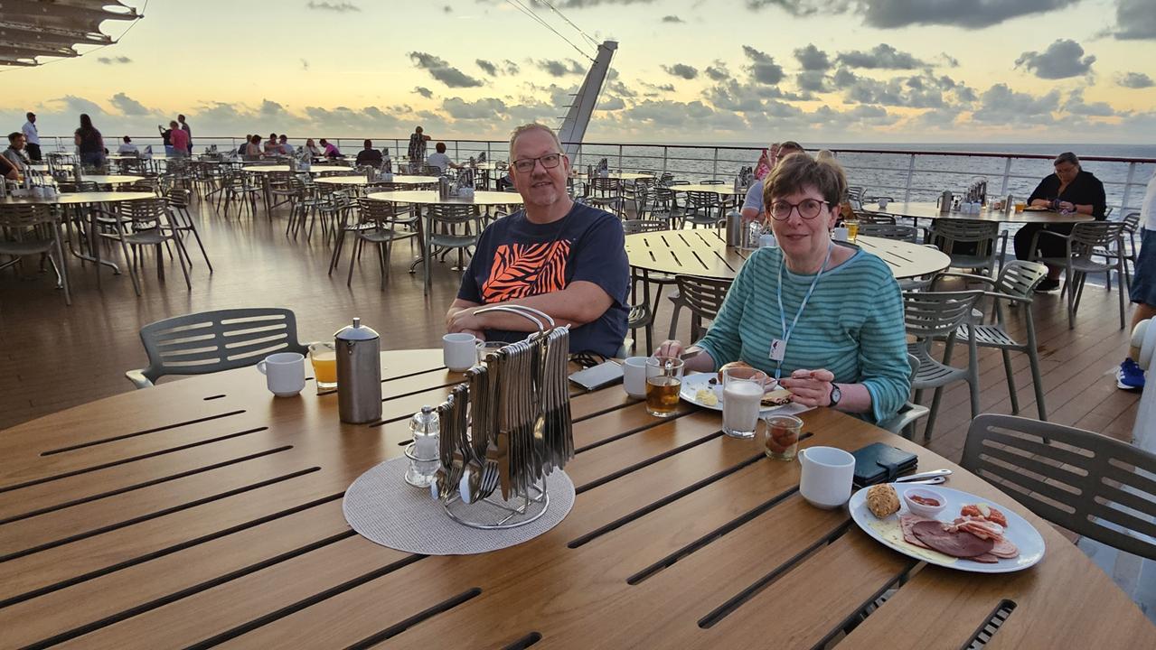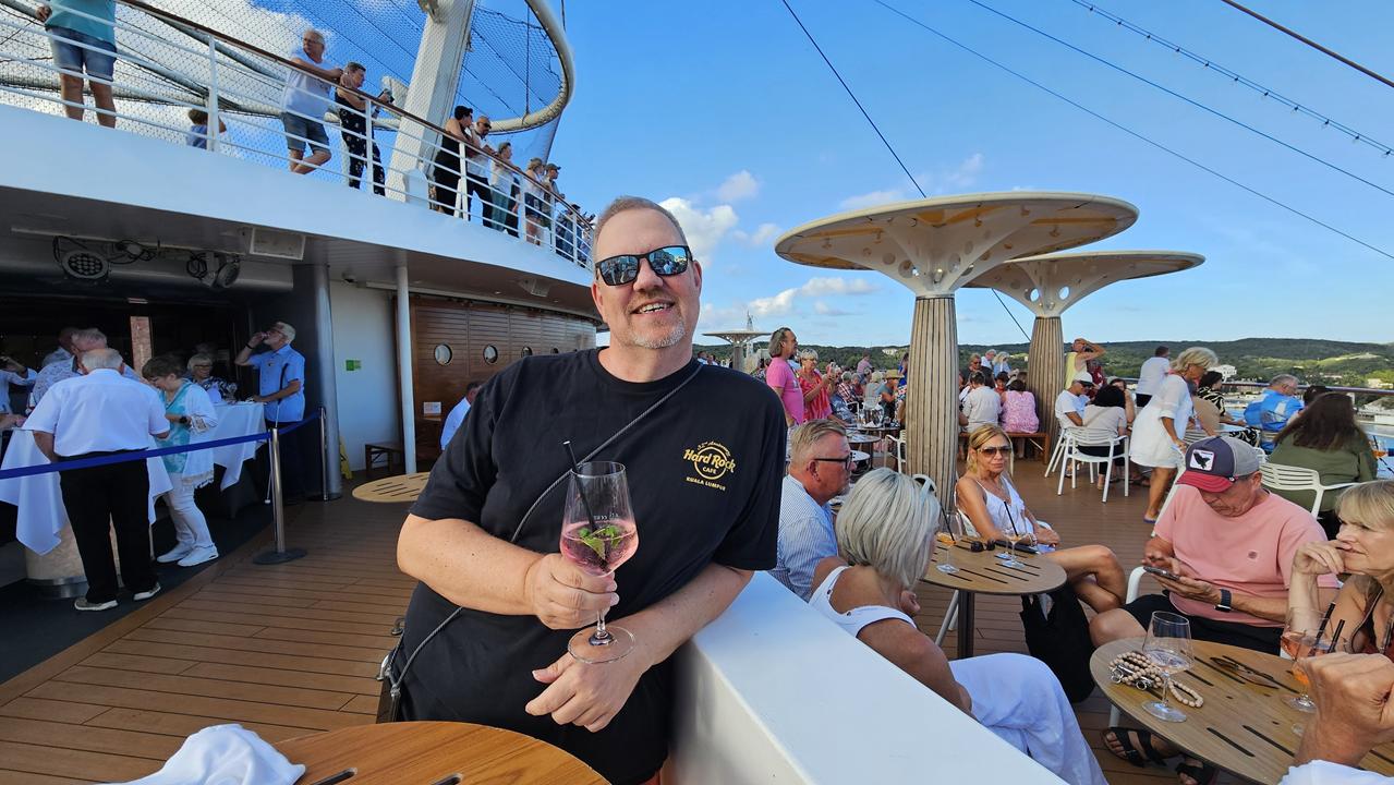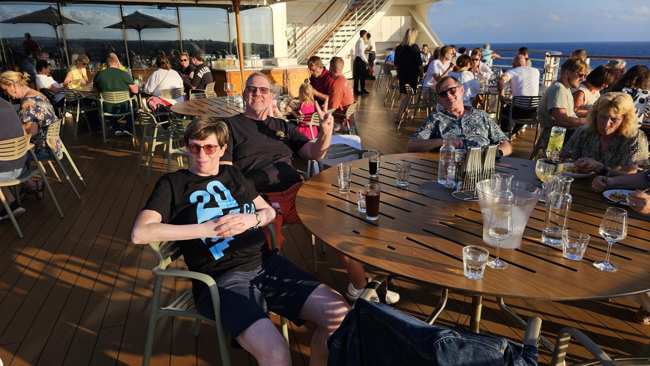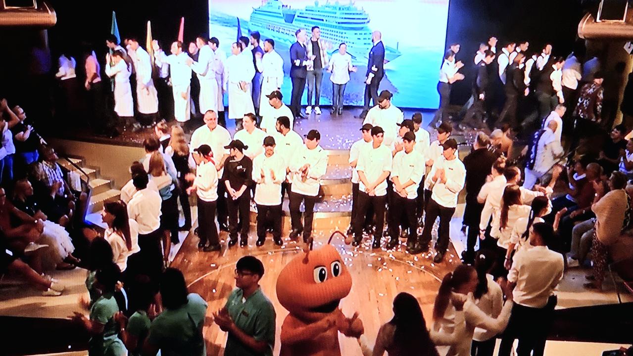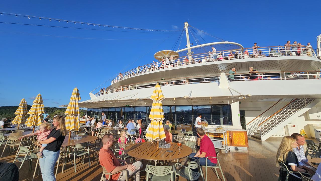 Das Theatrium ist bis auf den letzten Platz gefüllt – wir finden keinen Platz mehr. Doch auf Deck 11 entdecken wir freie Liegeinseln. Perfekt! Von hier aus verfolgen wir die Show auf dem Bildschirm und hören gleichzeitig live die Musik und Ansprachen. Bequemer geht’s kaum 😊