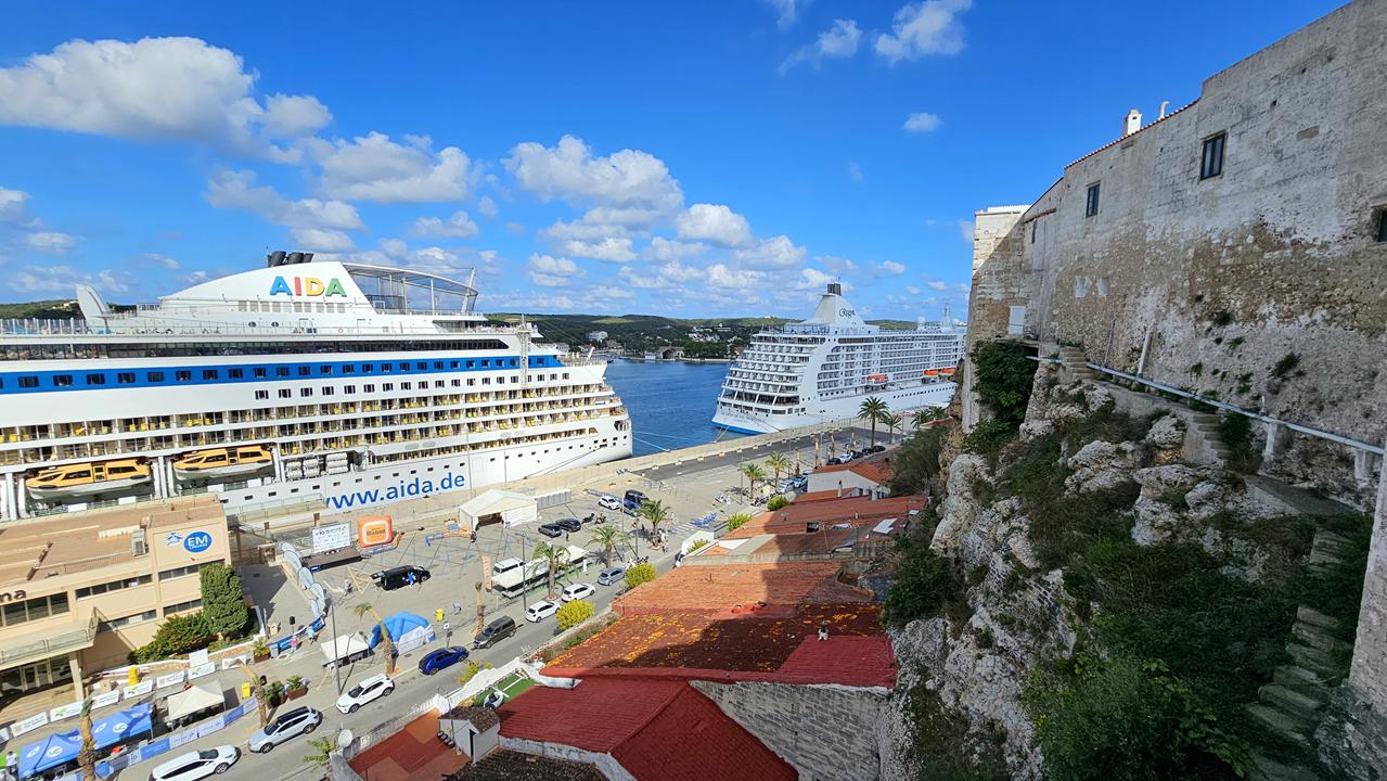 Am Ende der kleinen Gasse stehen wir direkt am Rand der Felsenkante, auf der Mahón thront. Vor uns öffnet sich ein traumhaftes Panorama über den gesamten Hafen – inklusive Blick auf die AIDAstella und Teile der Altstadt. Ein absolut irrer Ausblick, bei dem wir genüsslich stehen bleiben, tief durchatmen und diesen Moment einfach in uns aufsaugen.