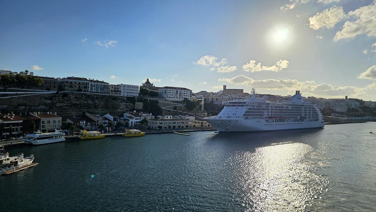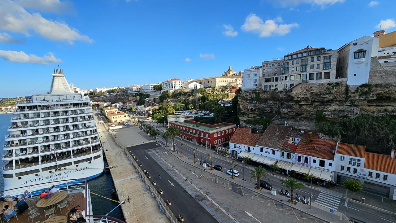 In Mahón legen Kreuzfahrtschiffe an der Estació Marítima an der Straße Moll de Ponent an – genau dort befindet sich auch unser Liegeplatz. Kurz vor 8 Uhr morgens erreichen wir nach einer beeindruckenden Fahrt durch den Naturhafen schließlich die Stadt. Mahón schmiegt sich wunderschön an die steile Felswand, darüber ragen der Glockenturm der Kirche Santa Maria, der Turm der Iglesia del Carmen, und zu ihren Füßen glitzert ein ganzes Spalier aus Segelbooten, Yachten und kleinen Schiffen.